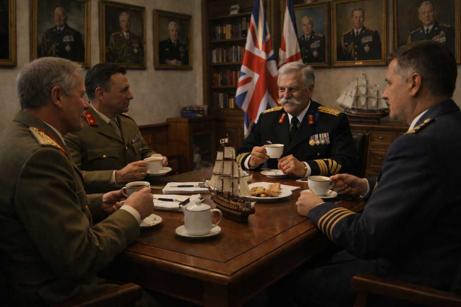 陸軍参謀長のサー・ジェームズ・ハリントン将軍はティーカップを口に運ぶ。