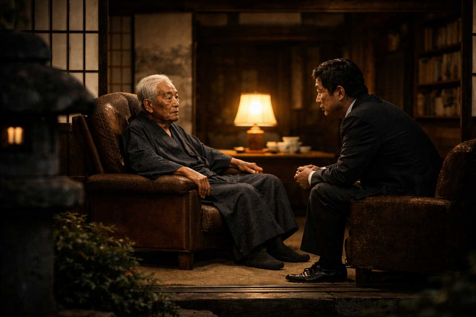人里離れた山村の古民家。その居間で、着物姿の老人と背広姿の男が向き合っていた。