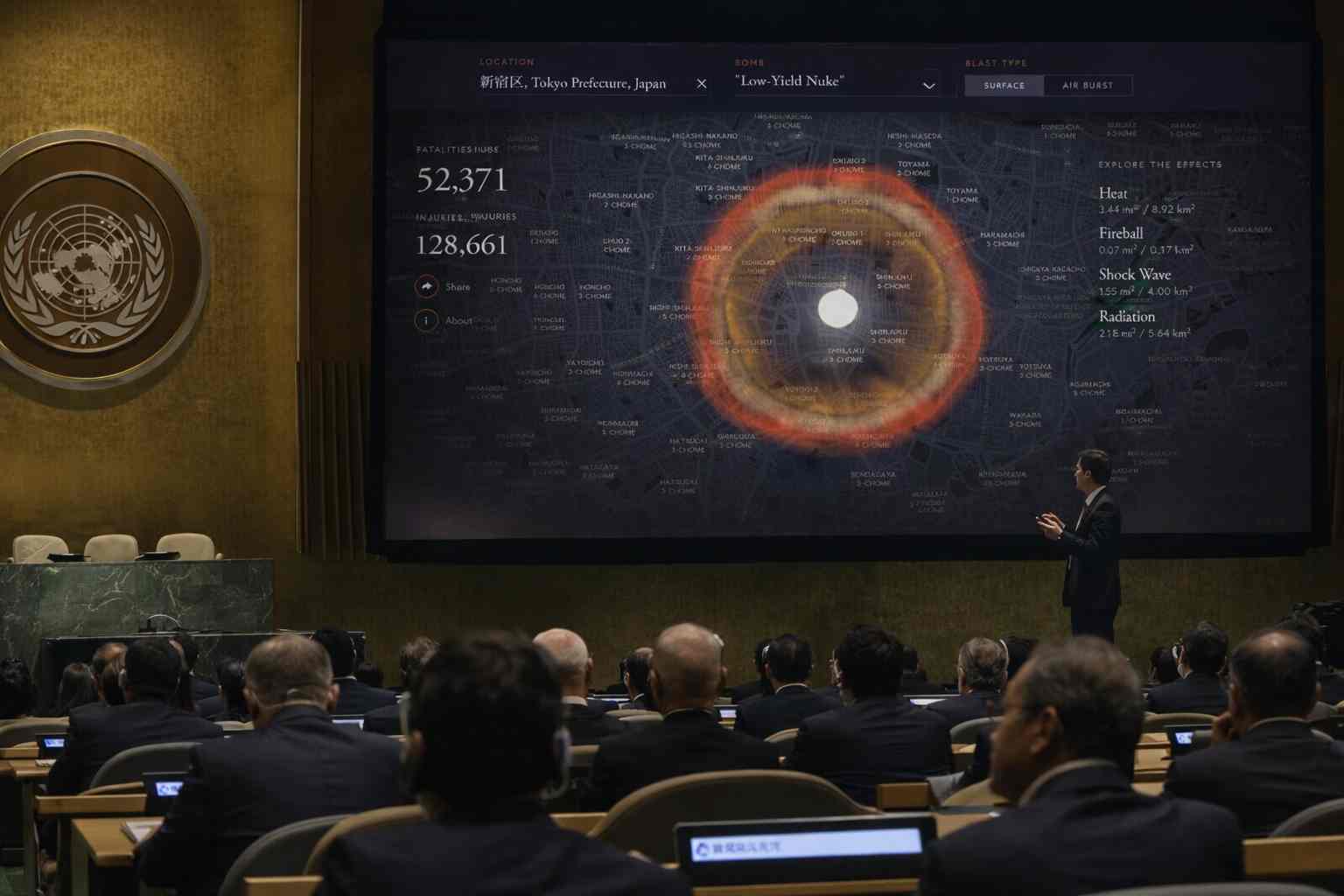 山田に紹介されたプレゼンテーターの声が議場に響く。スクリーンには核爆発のしくみを映像化した説明図が表示されている。